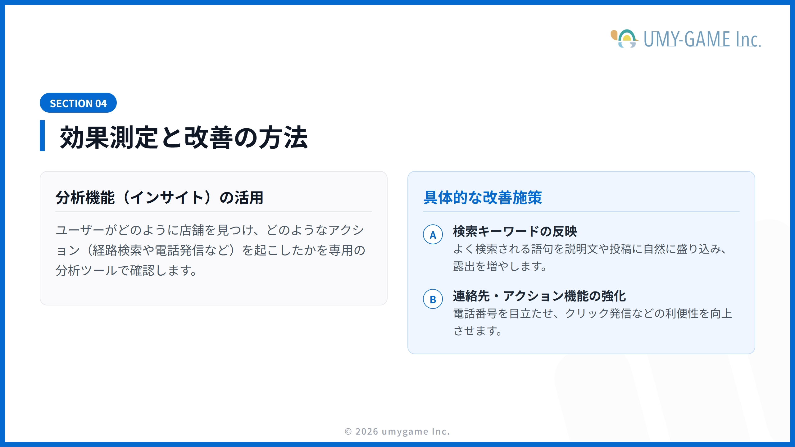 | キーワードの最適化 | ビジネス説明に地域・業種名を自然に挿入 | 検索順位の向上 |