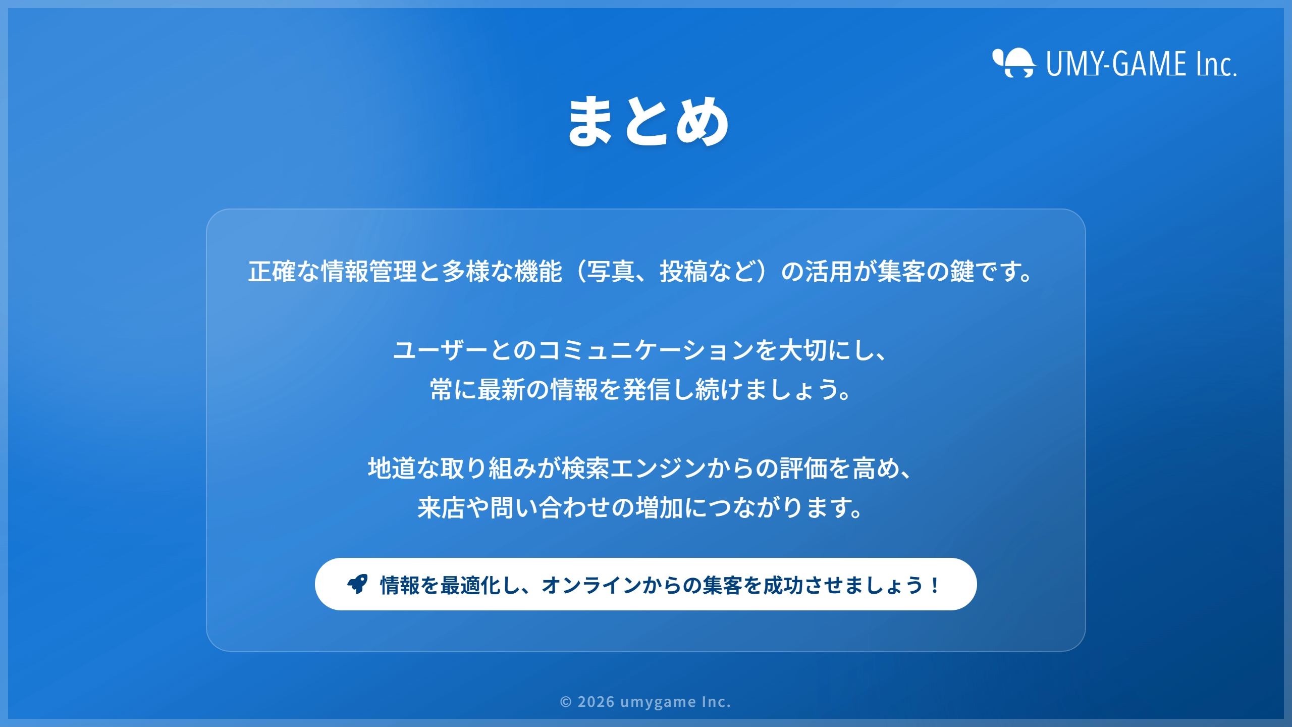 まとめると、Googleビジネスプロフィールは正確な情報管理を基本に、写真や投稿など多様な機能を活用することで集客効果が期待できます。常に最新の情報を示し、ユーザーとのコミュニケーションを大切にする姿勢が成功の鍵です。こうした地道な取り組みを継続することで、検索エンジンからの評価が高まり、結果として来店数や問い合わせ件数の増加へとつながります。