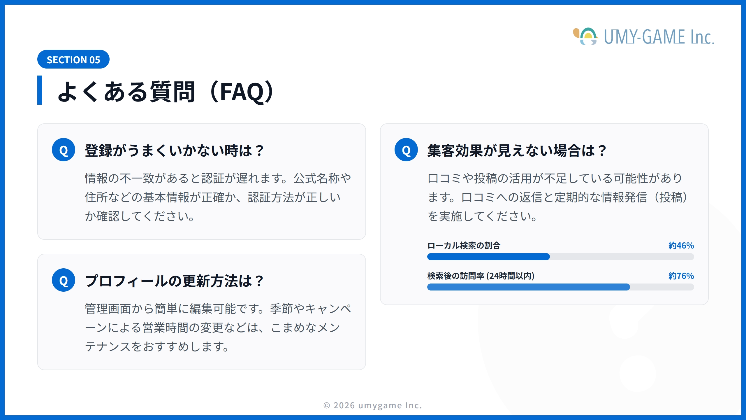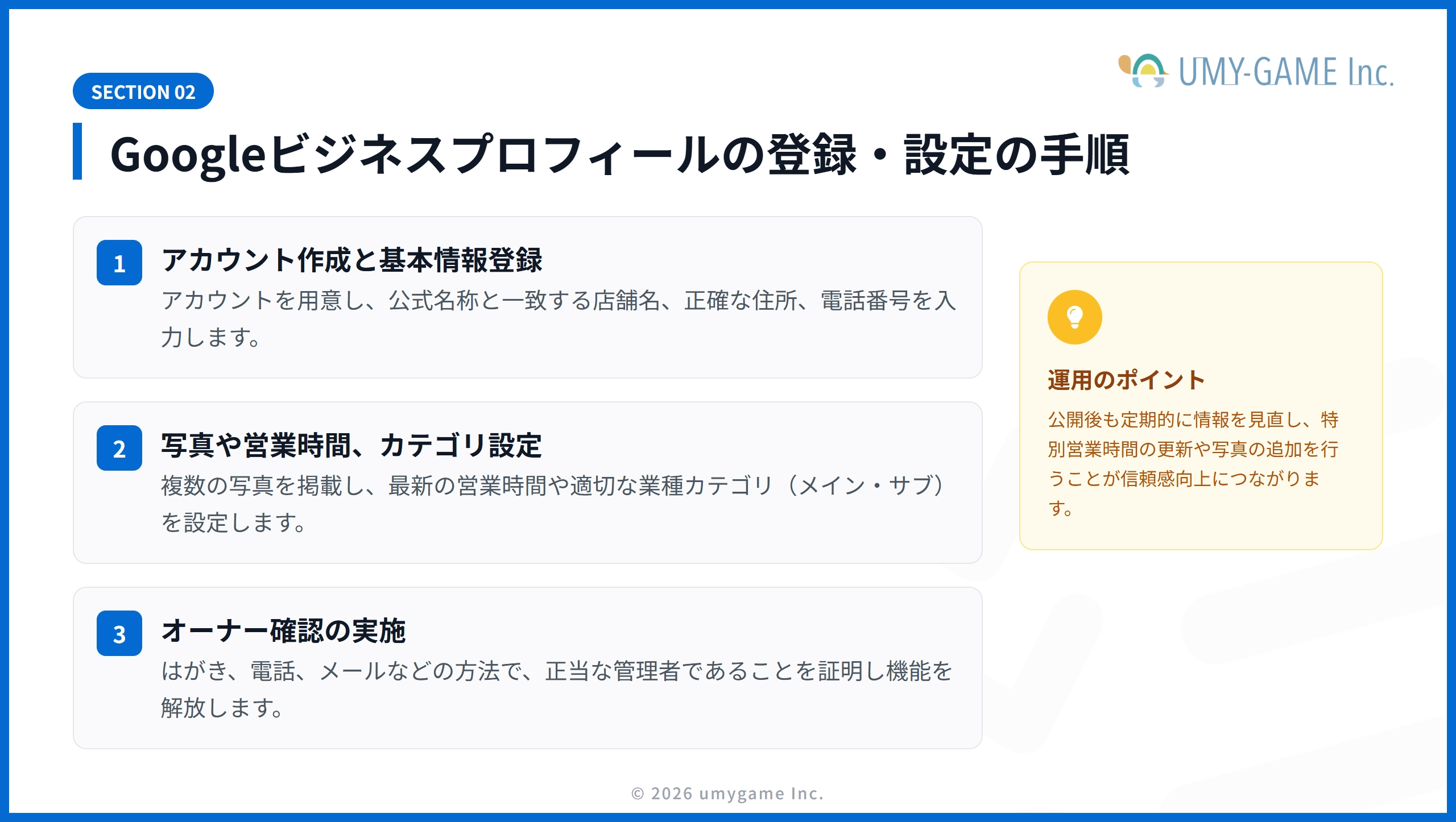 ビジネス情報は、ユーザーに来店・来院してもらうために非常に大切なものです。すべての情報を正しく登録するようにしましょう。