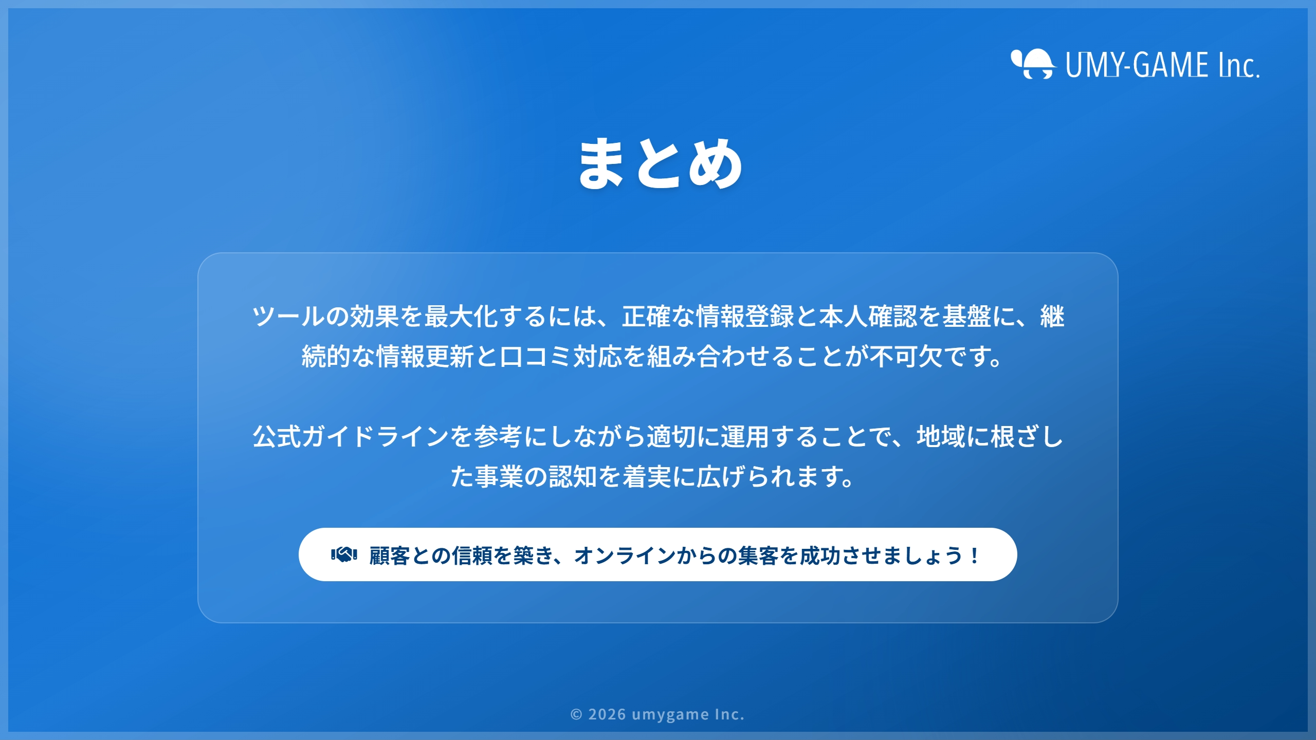 無料で開設でき、簡単に情報を入力できる点は大きな魅力ですが、運用を続けられず、古い情報のまま放置してしまうのでは意味がありません。常に情報を最新に保ち、魅力的な写真や動画の投稿・口コミへの返信など、ユーザーのニーズに沿った情報作成を続けていく必要があります。また、ユーザーからだけではなく、Googleからの評価を上げることにより、Googleビジネスプロフィールの情報が上位に表示されやすくなります。ガイドラインを遵守し、適正な方法でGoogleビジネスプロフィールの充実化に努めましょう。