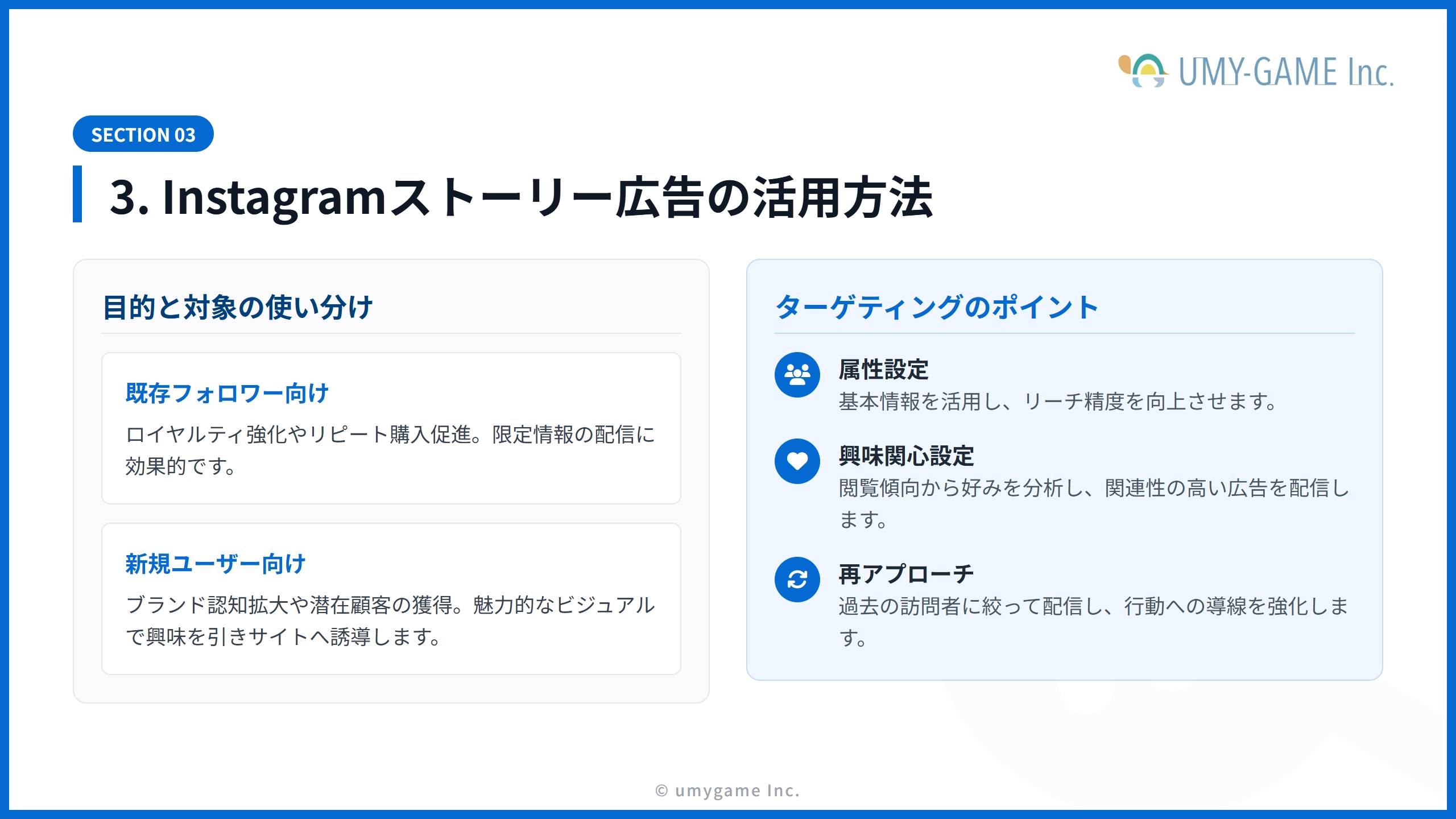 このように、Instagramストーリー広告は「短く、強く、直接的」に訴求したい場合に適しており、フィード広告は「情報量を増やし、深く理解してもらう」用途に向いています。マーケティングの目的やターゲット層の行動パターンを踏まえて適切に使い分けることが、広告効果最大化の鍵となります。