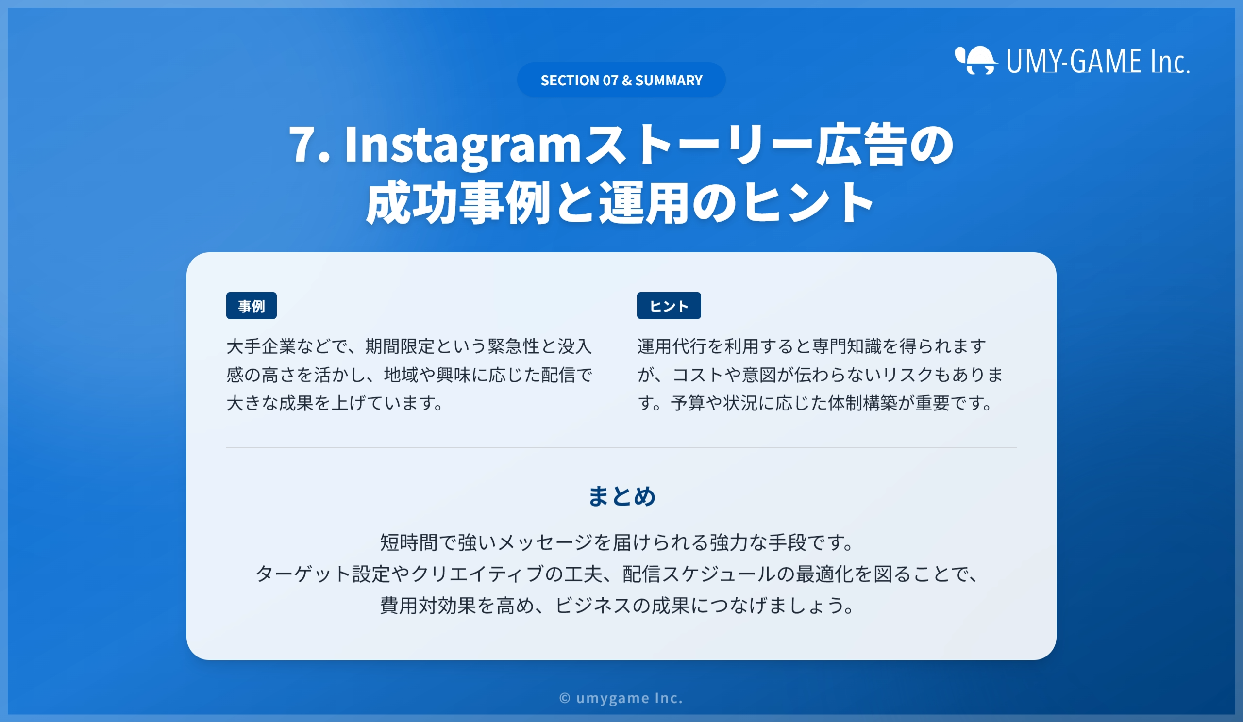 広告代理店の活用は専門性と効率化に寄与しますが、コストやコミュニケーション面の課題を考慮し、最適な運用体制を構築することが重要です。これらのポイントを押さえた運用が、Instagramストーリー広告の効果的な使い方につながります。