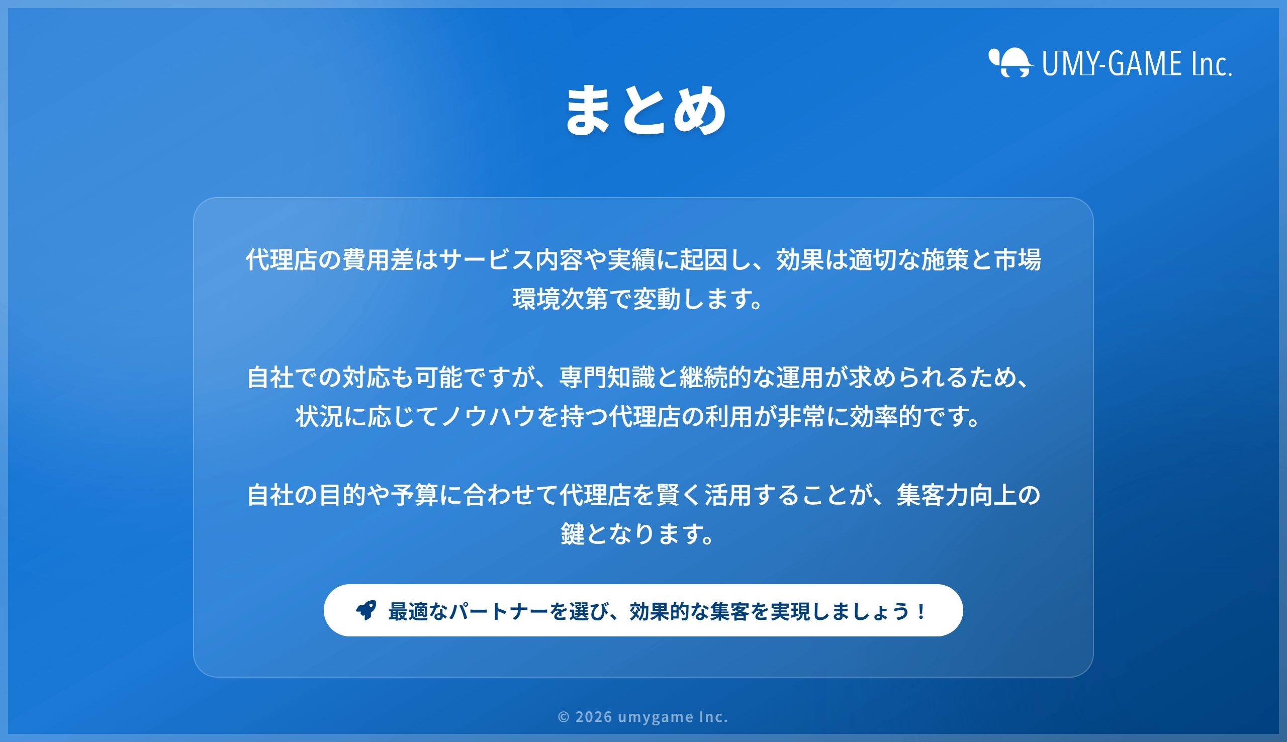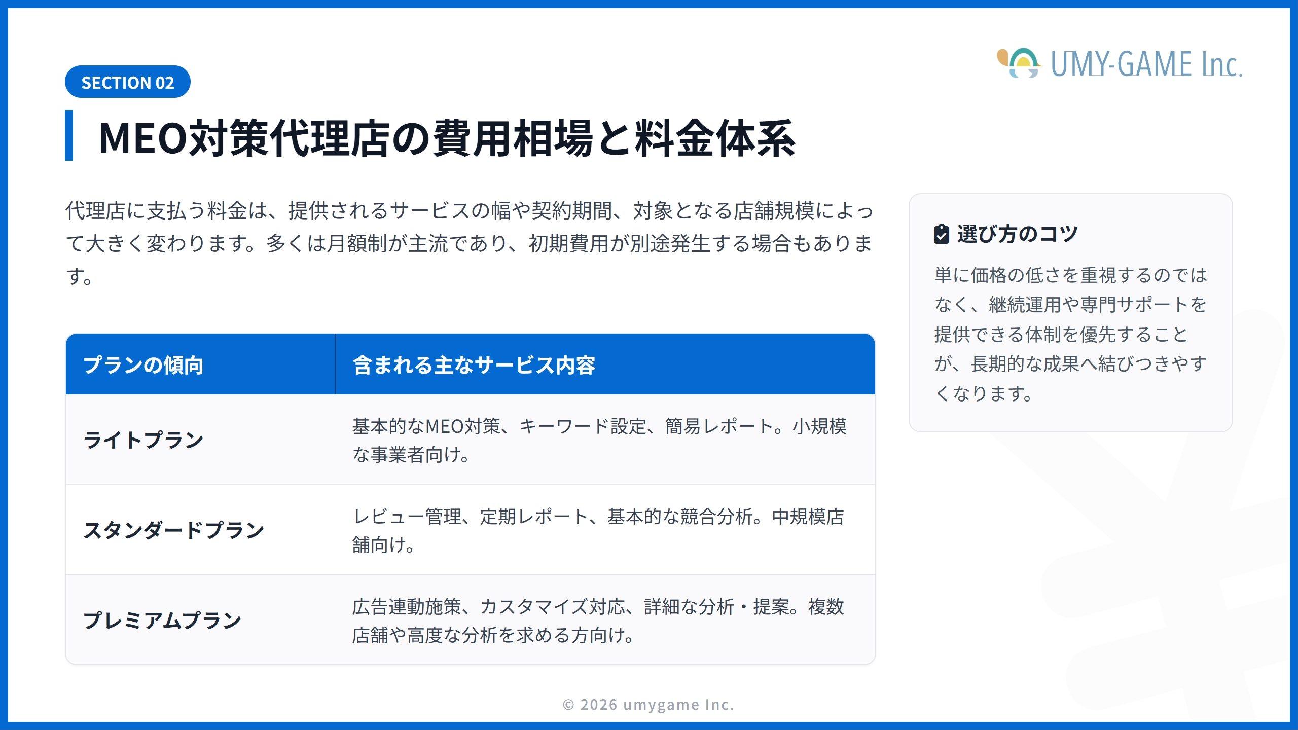 | 代理店比較 | 料金・実績・サポート体制を複数の代理店で比較検討する |