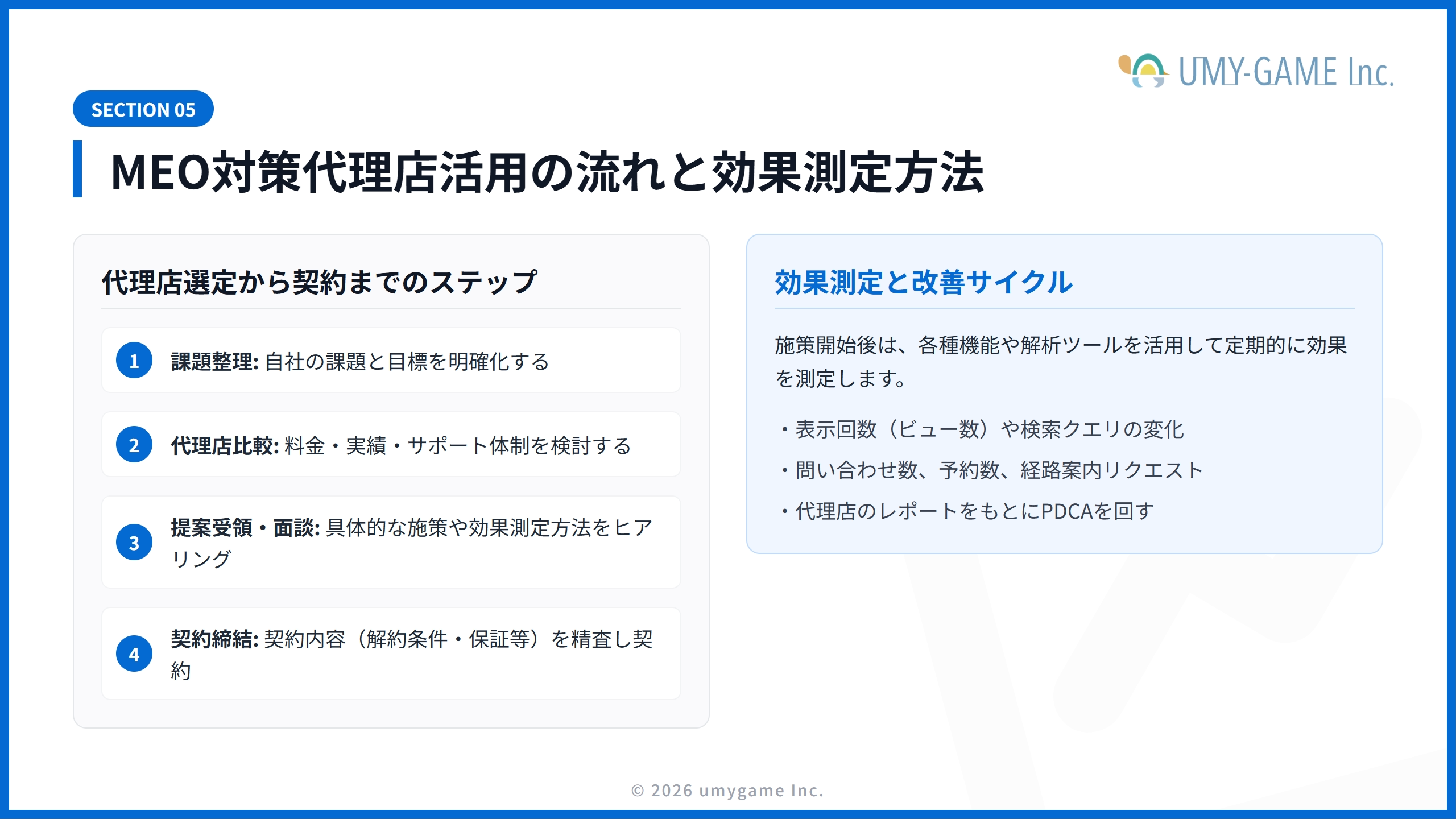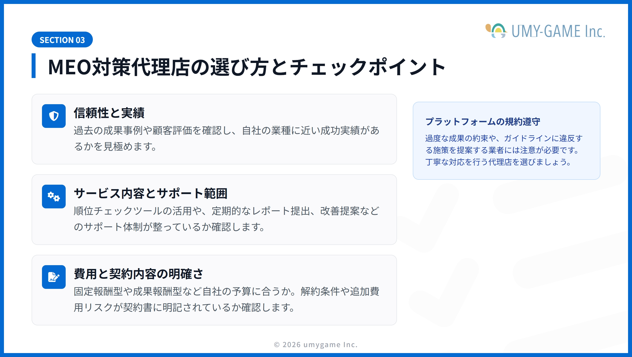 MEO対策代理店を選ぶ際は、以下4つのポイントを重視すると効果的です: