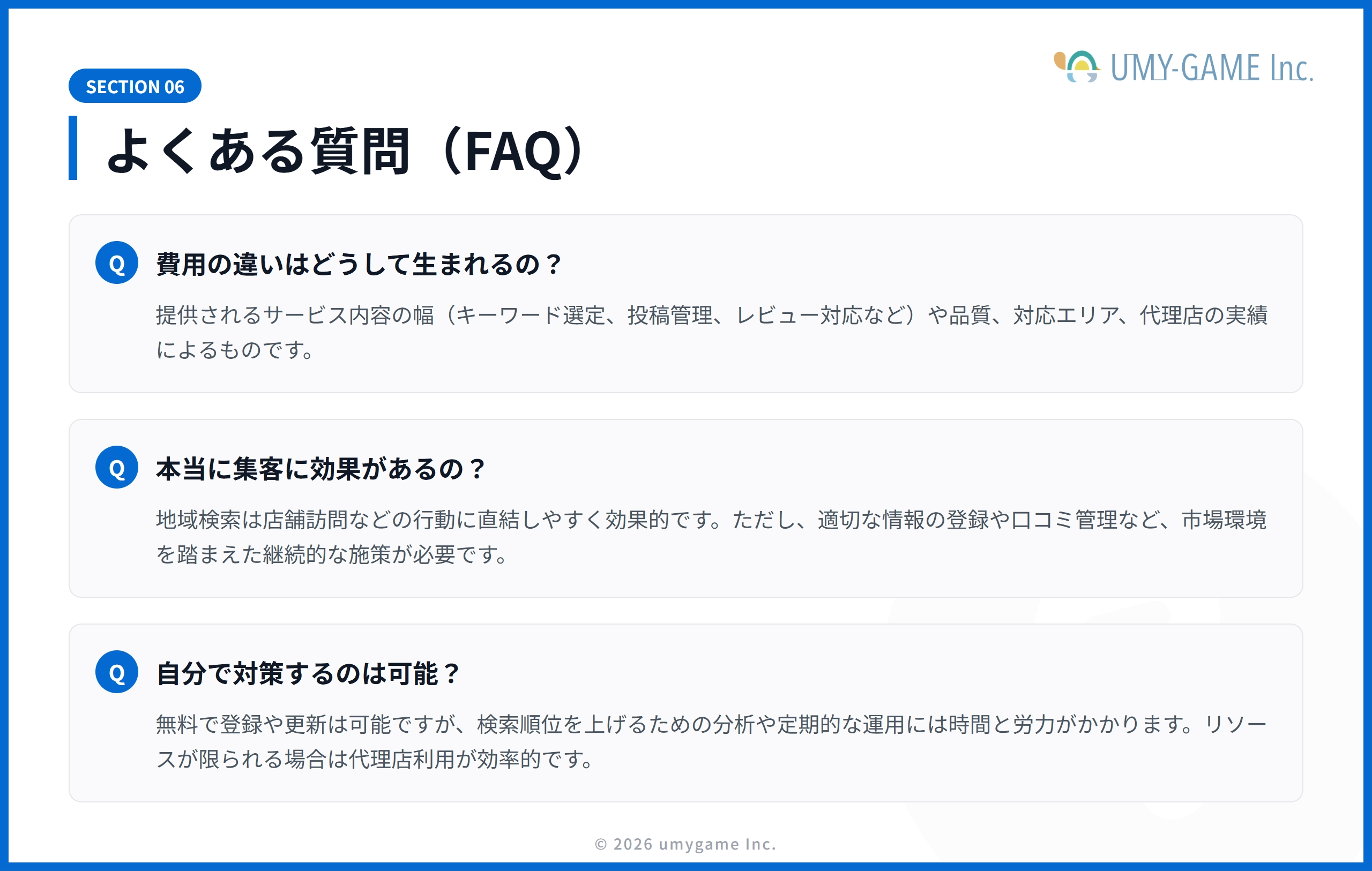 まとめると、MEO対策代理店の費用差はサービス内容や実績に起因し、効果は適切な施策と市場環境次第で変動します。自社での対応も可能ですが、専門知識と継続的な運用が求められるため、状況に応じて代理店の利用を検討すると良いでしょう。