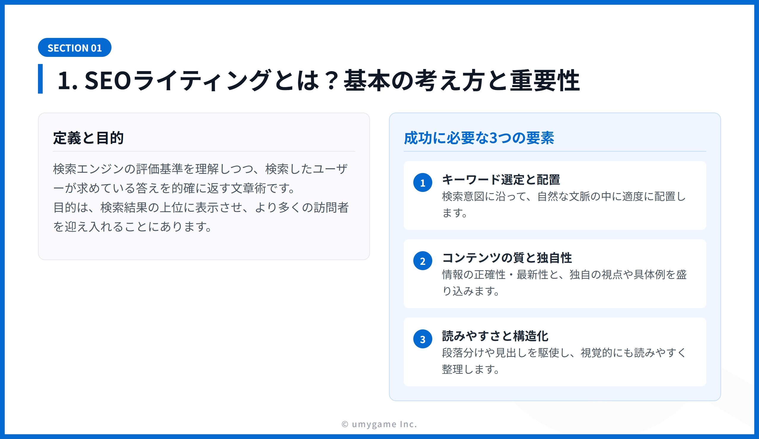 SEOライティングの成功には、主に以下の3つの要素が重要です。