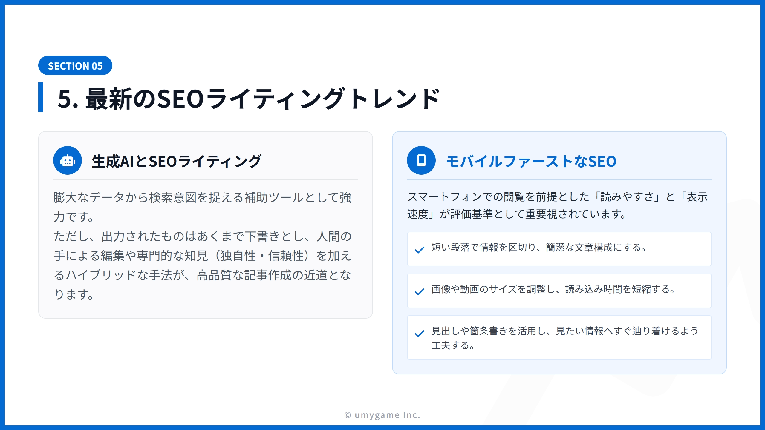 同時に、スマートフォンでの閲覧を前提とした「読みやすさ」や「表示速度」の改善も無視できません。これらはユーザー体験(UX)を向上させ、SEOの成果を左右する決定的な要因になります。現代の検索環境で勝ち残るためには、こうした変化への適応が必須条件と言えるでしょう。