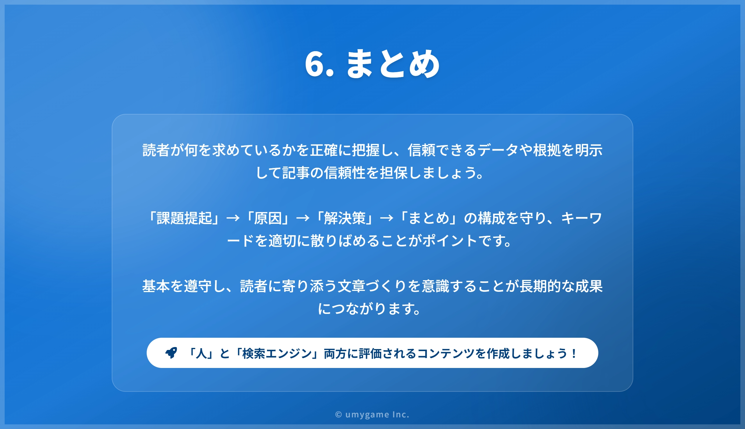 信頼できるデータを基にした正確な情報提供と、ユーザーファーストの視点を持つことが、長期的なSEO成功の鍵です。